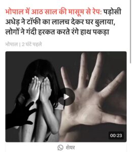 भोपाल 8 साल की मासूम से रेप..पड़ोसी अधेड़ ने टॉफी का लालच देकर घर बुलाया… लोगो गंदी हरकत करते हुए रंगे हाथ पकड़ा..